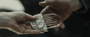 “The comb was an absolutely nightmare,” Cook says, with a laugh. “I came up with the teeth design where it’s kind of sharp and spindly and then the two at the end come in. A friend who read the script had the idea that the comb could be lethal, so in the earlier drafts, the comb wasn’t actually that sharp. It could act like a knife. With the merman design etched into it, that came from a real antique comb that my production designer found. It took ages and ages, but it’s a mixture of three different people’s thoughts. It’s a lot of pressure for a prop.”