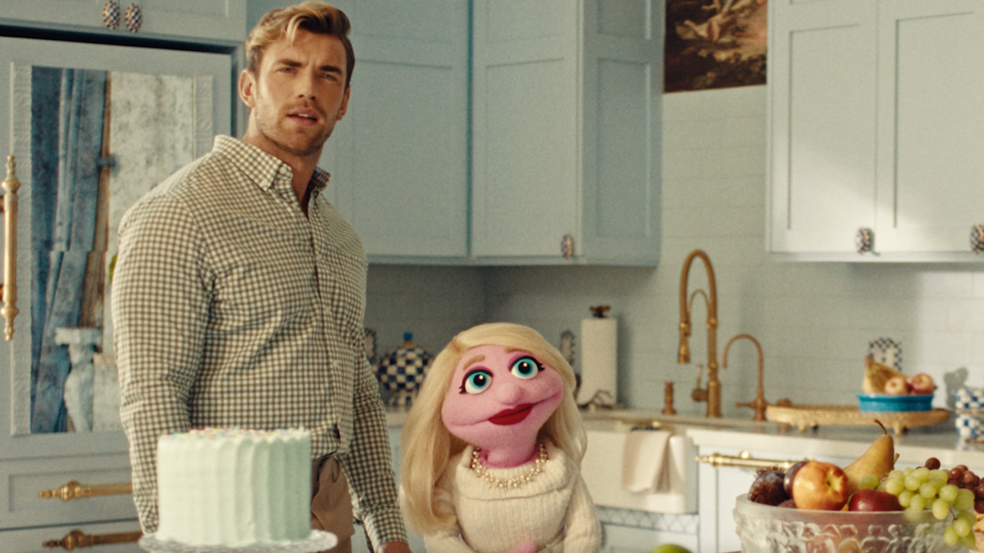 That intelligence is also imbued into the creation of the lore of Marilyn Muff. When Louie enters her home, there are posters and snapshots of her and her storied career all over the walls. It’s hell for Xander but heaven for Louie. Audiences will, no doubt, put their own love of women into the mirror of Marilyn. I see a lot of Shirley MacLaine (I really should re-watch Postcards from the Edge…) and Judith Light in Lewis’ beloved creation, but it’s taken even further by her being a puppet. And when you think of The Muppets, one particular character comes to mind…
