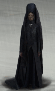 “My main thing for the Sisterhood was the silhouette,” Nikitović says. “When you’re doing something that is so uniform, you have to find that so it’s recognizable and strong, but you also have to find the fabric that works well with the silhouette too. I love how the fabric moves behind them when they are walking down these corridors. It flows behind them so well. For Emily [Watson] we wanted the embossing and texture on hers, and we wanted to create that mysterious necklace that she’s always wearing. When she goes to Salusa Secundus, she puts on her mother superior full garb and the metal details were put onto her costume, which were created with that same hand-printed technique. Our metal guy made every piece separately according to the design, and our milliner created that wonderful veil for her.”