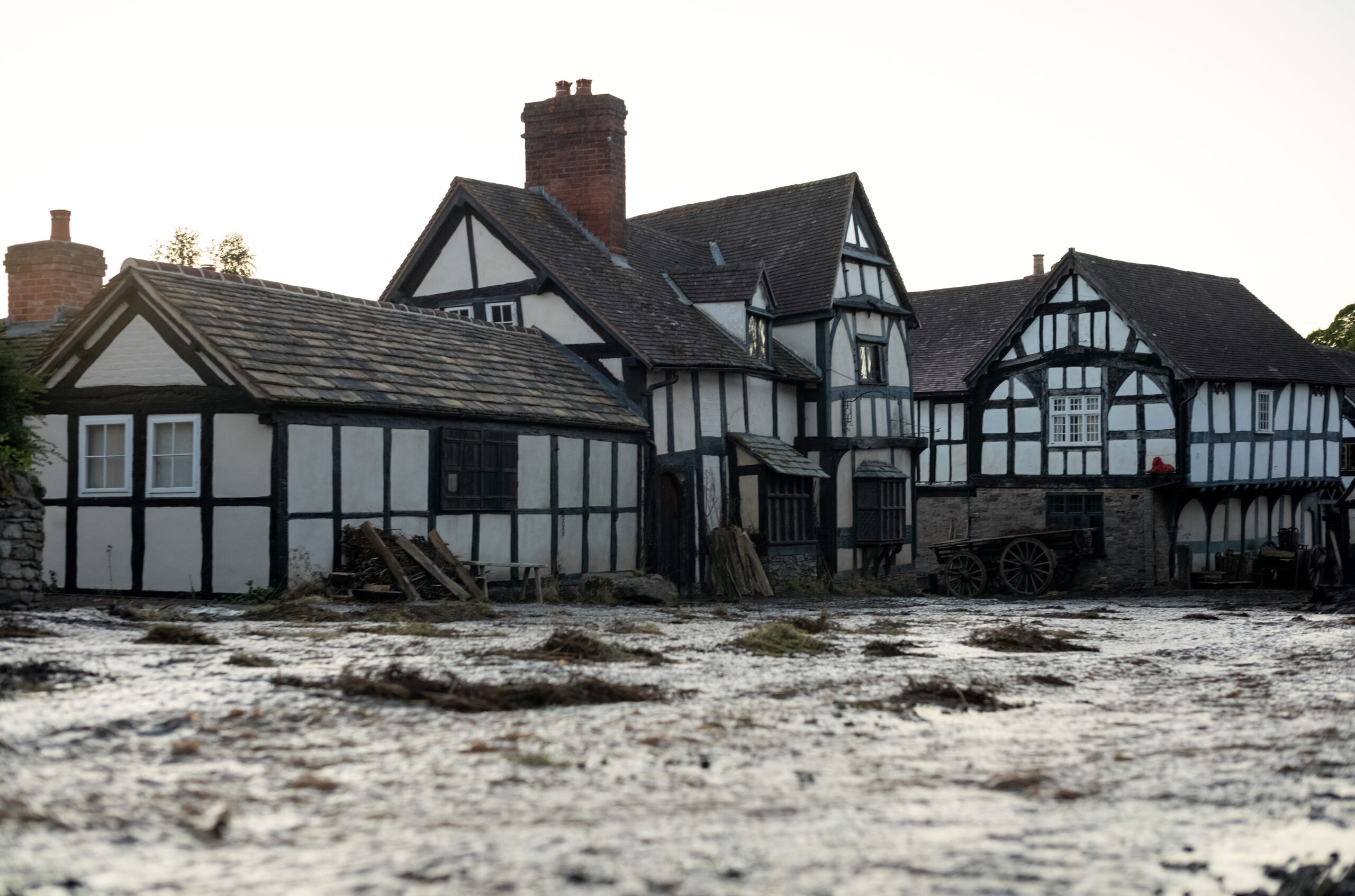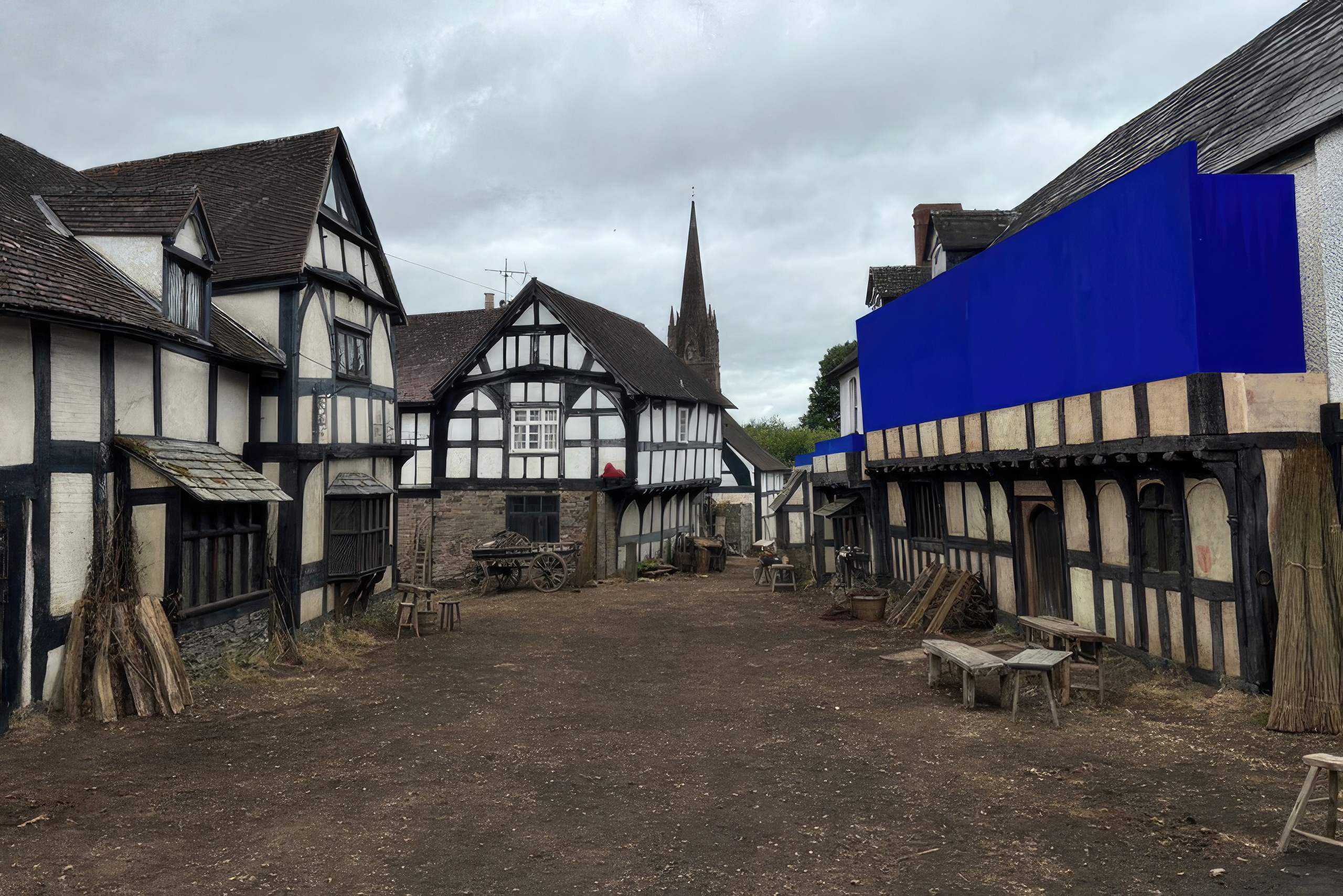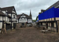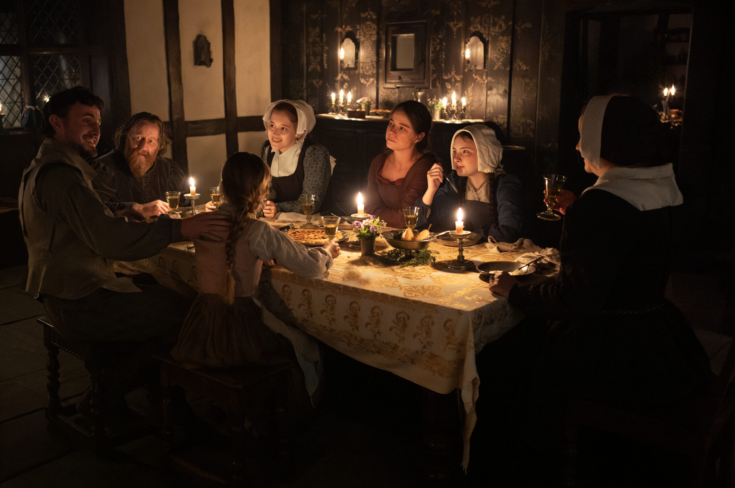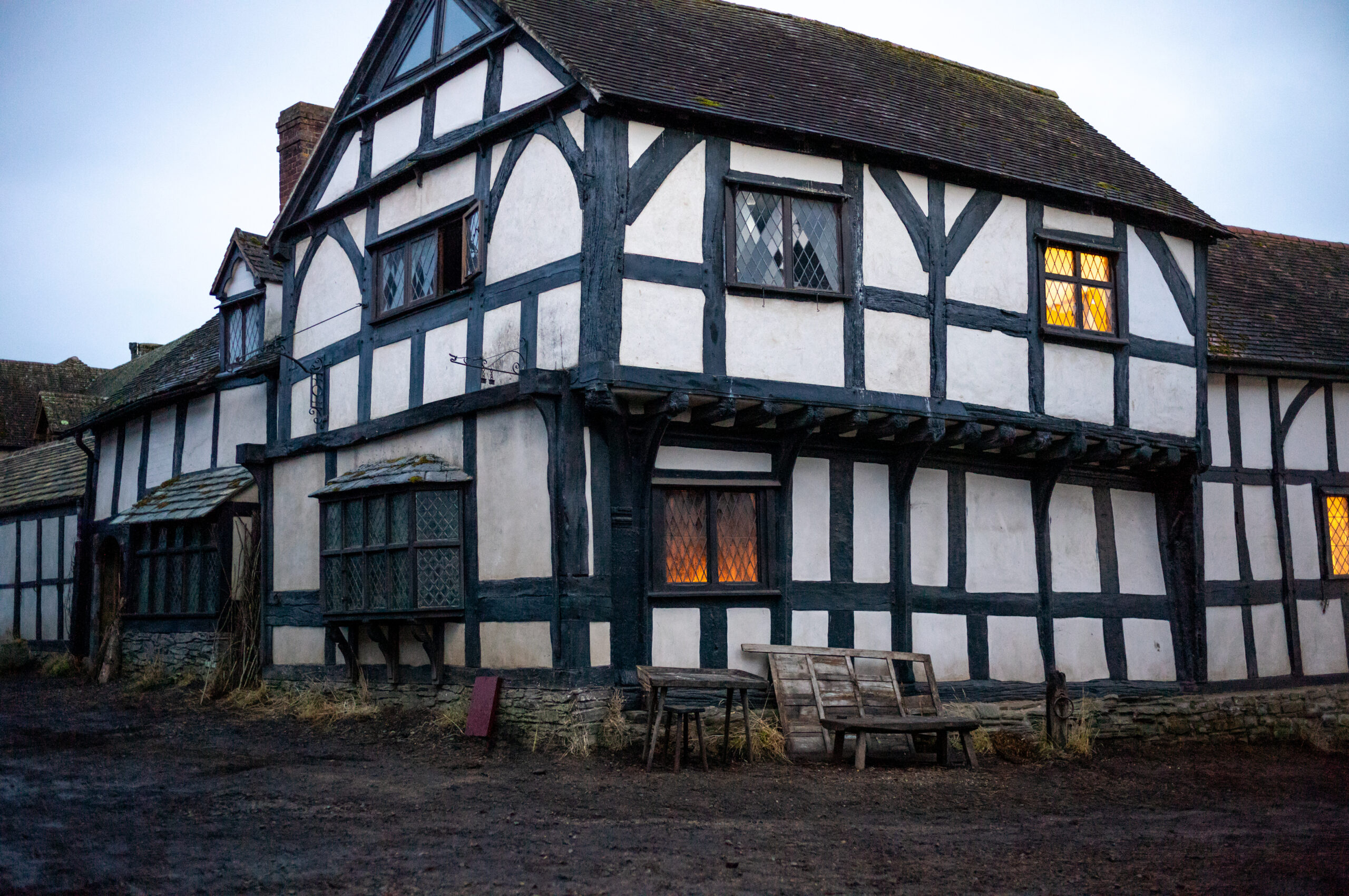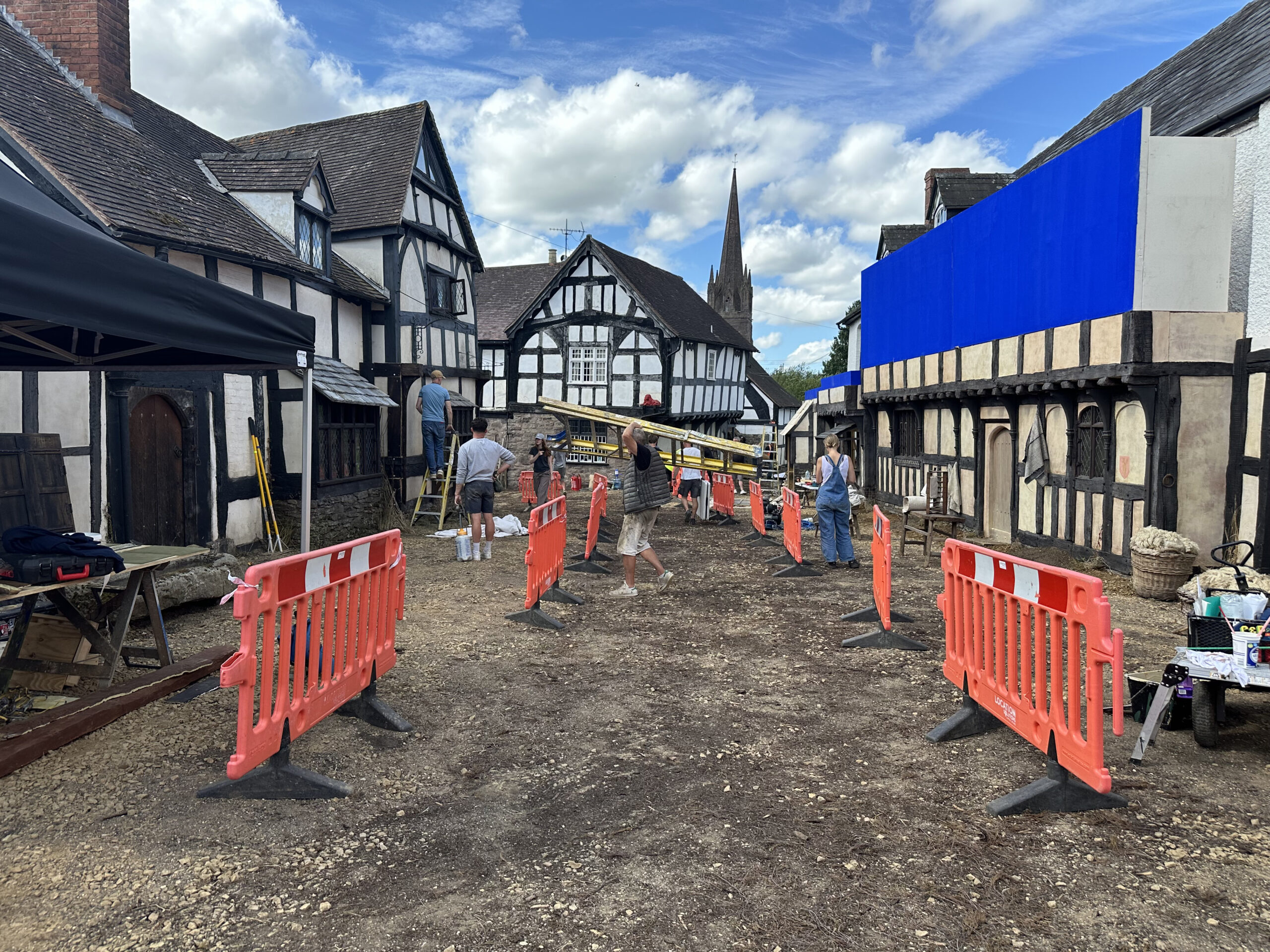 We worked with an existing location for the exterior street and adjusted the houses, adding façades and creating a dirt road. It was a strong fit for Stratford-upon-Avon and gave us good angles for our exteriors. The locals who live there seemed to enjoy seeing the transformation. We worked with the natural shape of the village, and Fiona and Chloé were careful in finding a location that felt right for this part of the story. Weobley had never been filmed before, so it felt fresh and new as a setting.