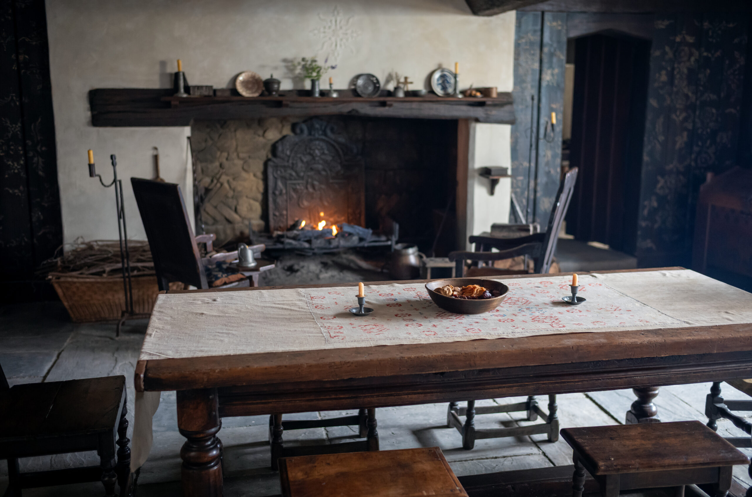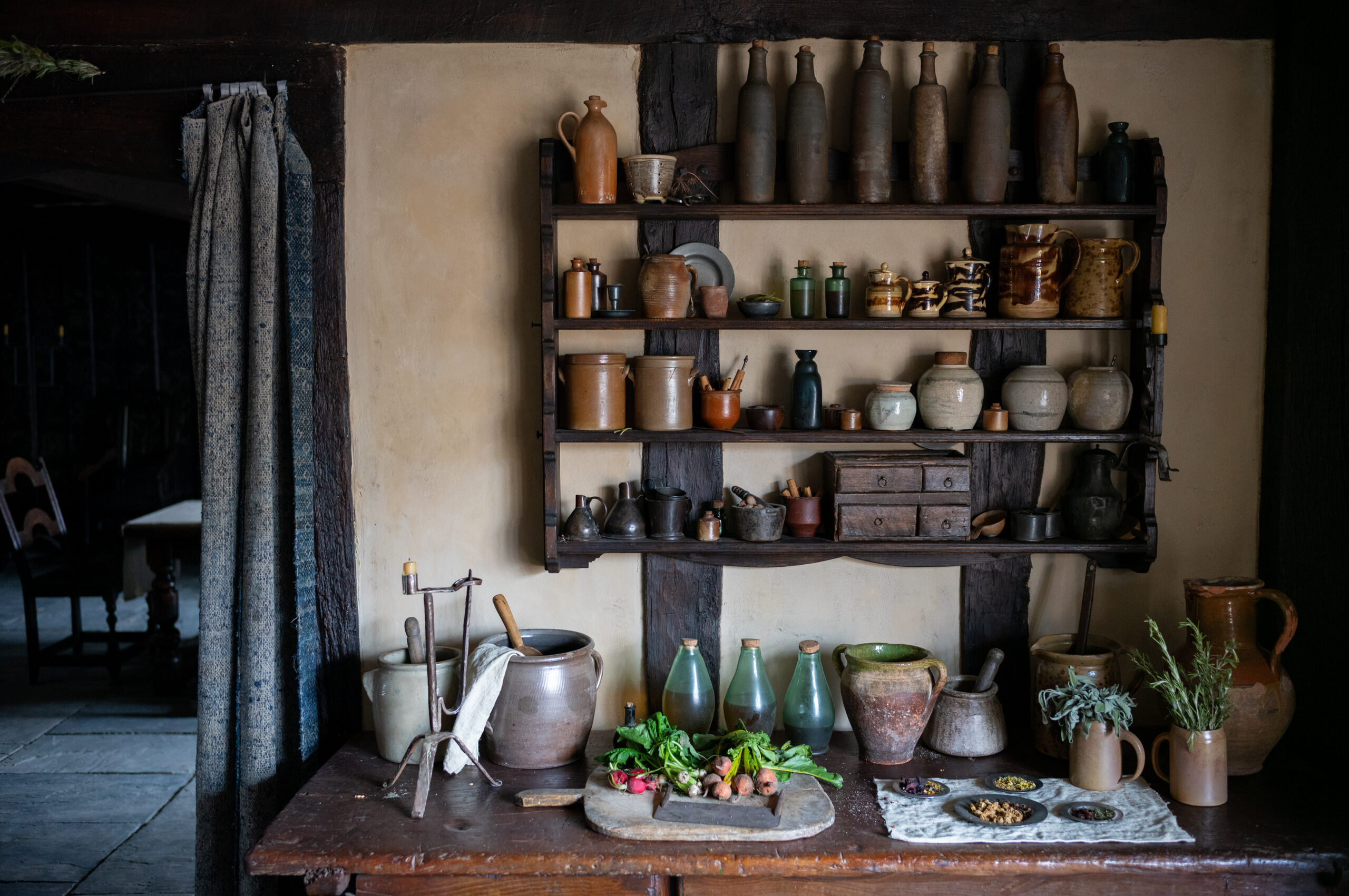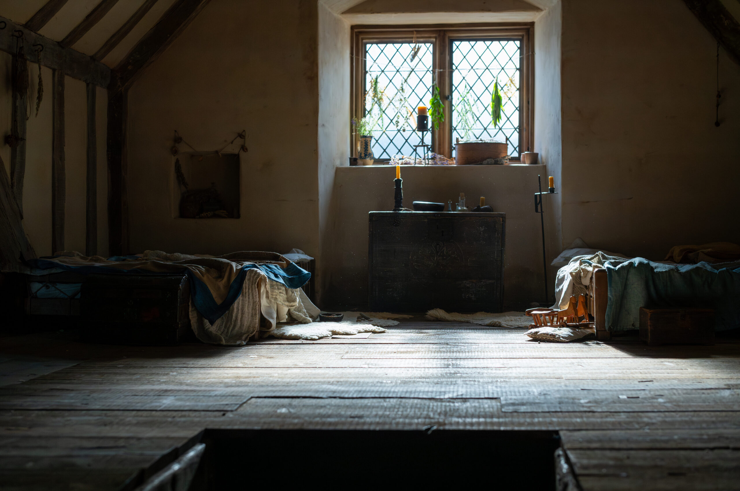 When Agnes arrives in Henley Street after she marries Will, we wanted to bring elements of her connection to nature into every space she inhabits. This was done through carefully selected herbs, both fresh and dried. A slightly unmade bed, tones of burnt orange and deep red, and natural textures helped carry her presence into those interiors.