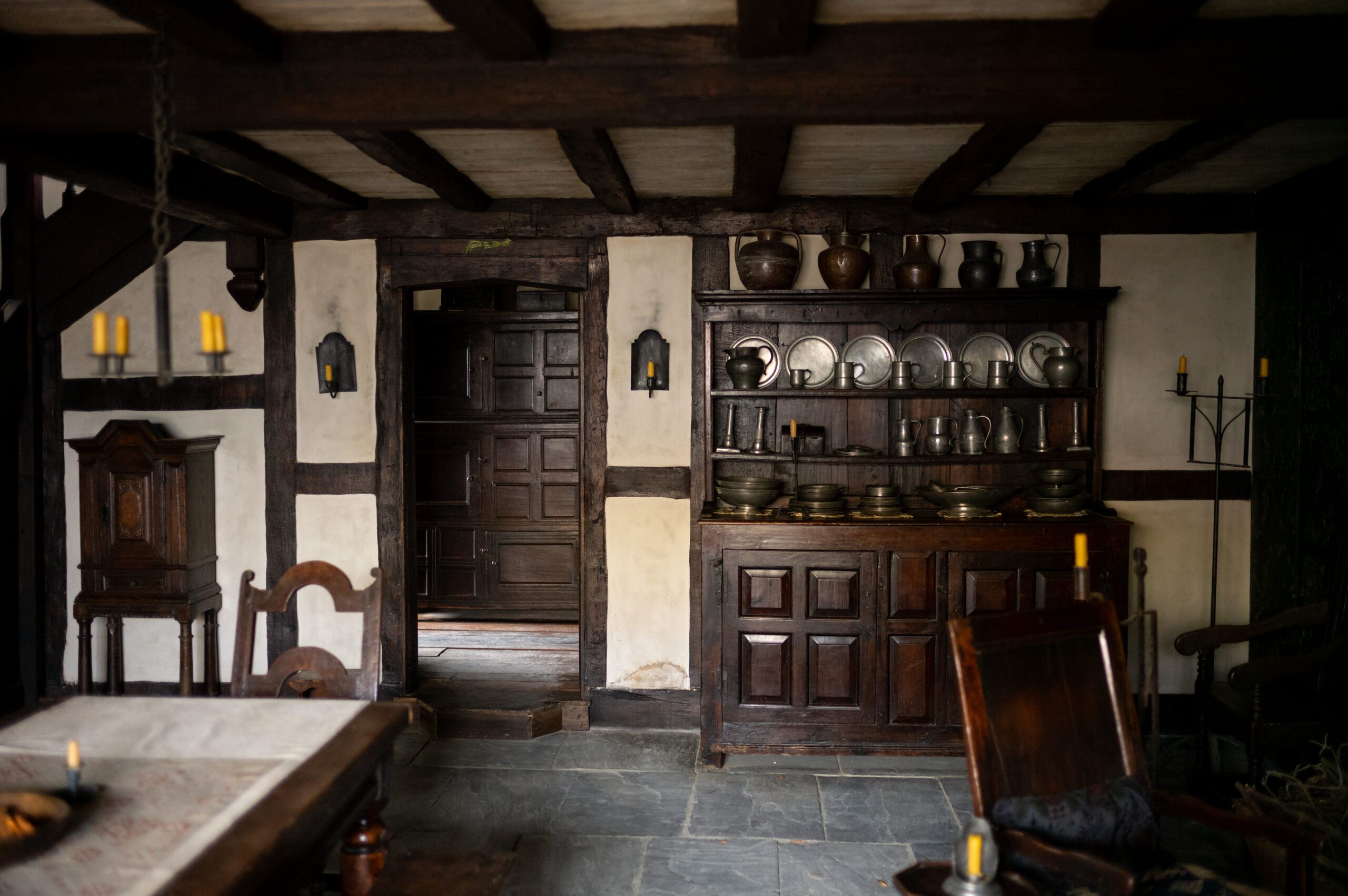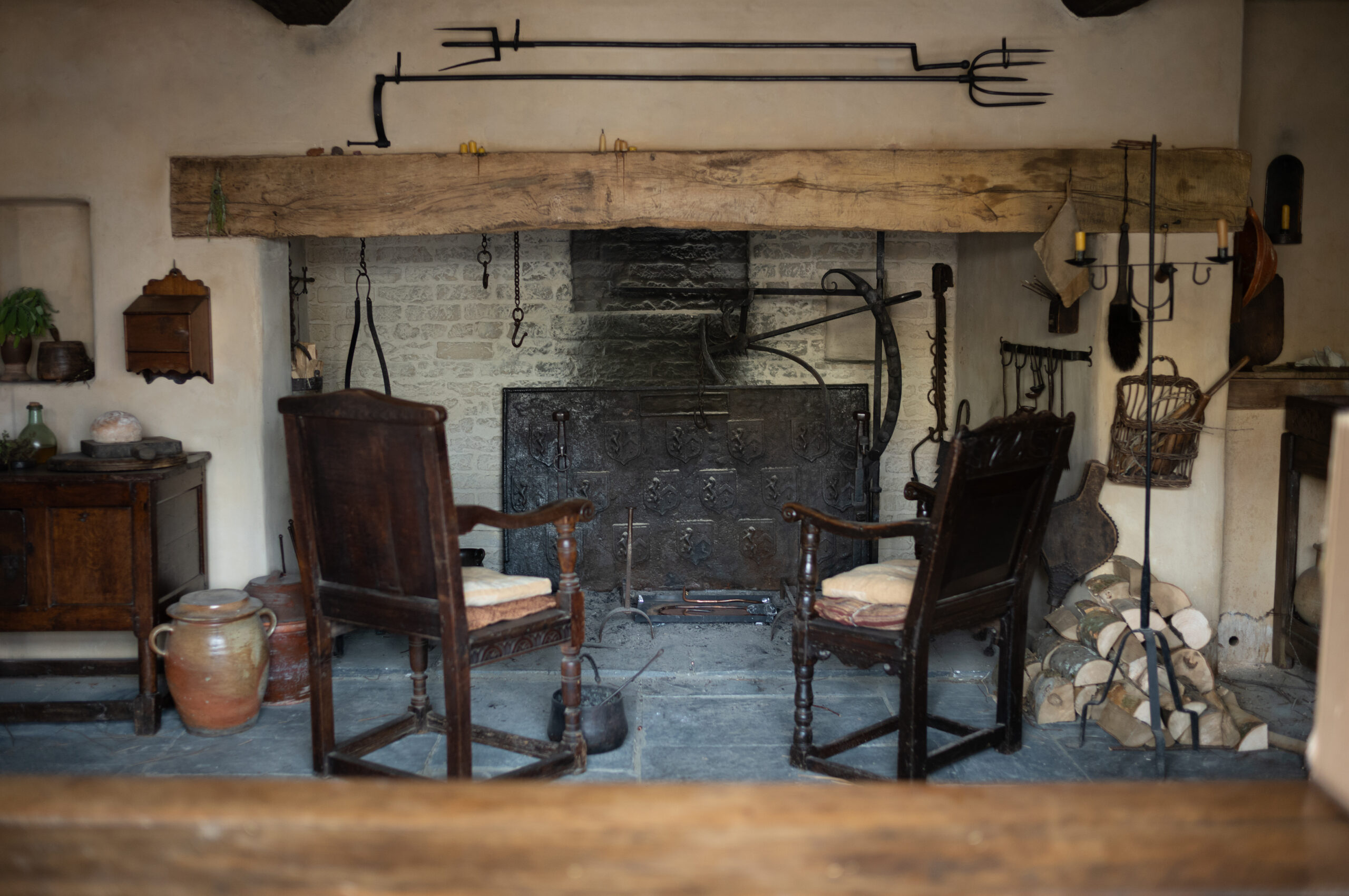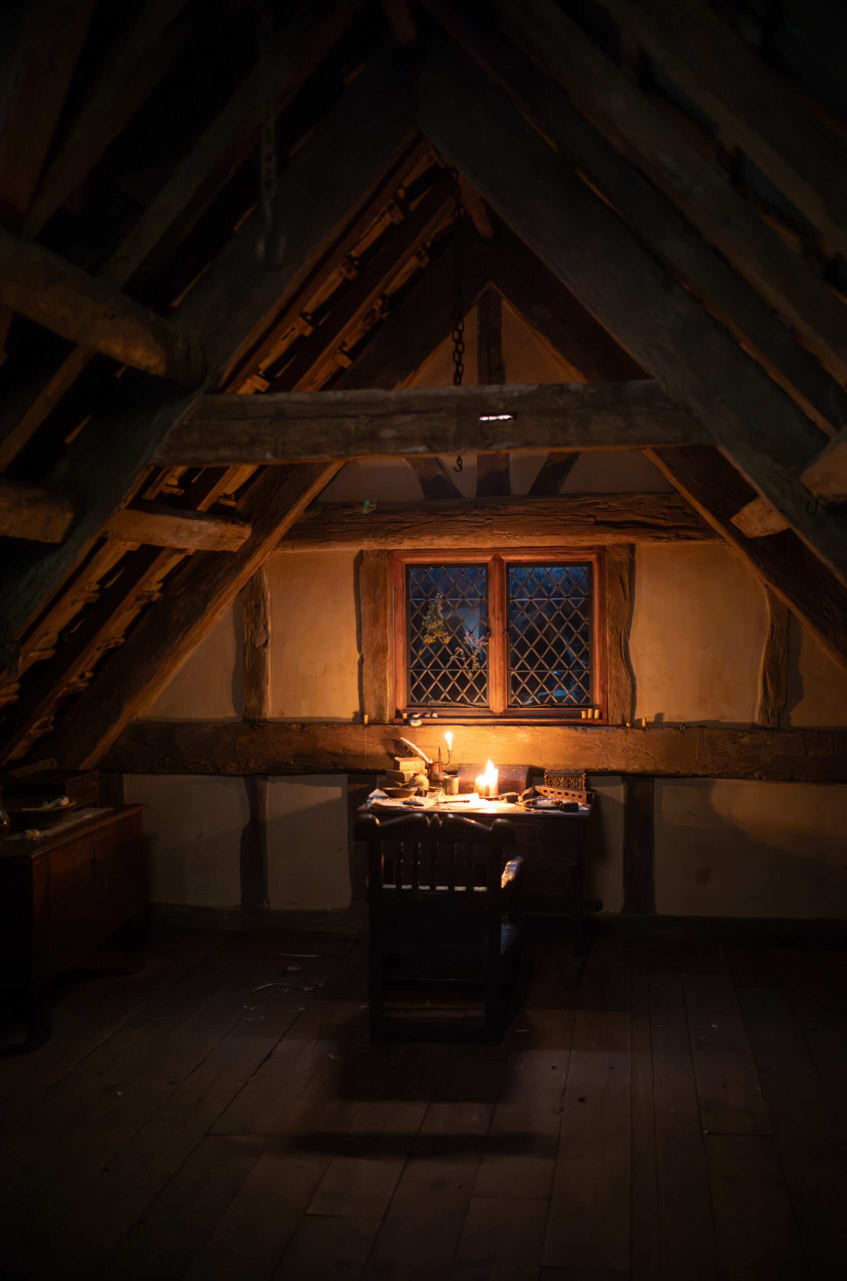 When Agnes arrives in Henley Street after she marries Will, we wanted to bring elements of her connection to nature into every space she inhabits. This was done through carefully selected herbs, both fresh and dried. A slightly unmade bed, tones of burnt orange and deep red, and natural textures helped carry her presence into those interiors.