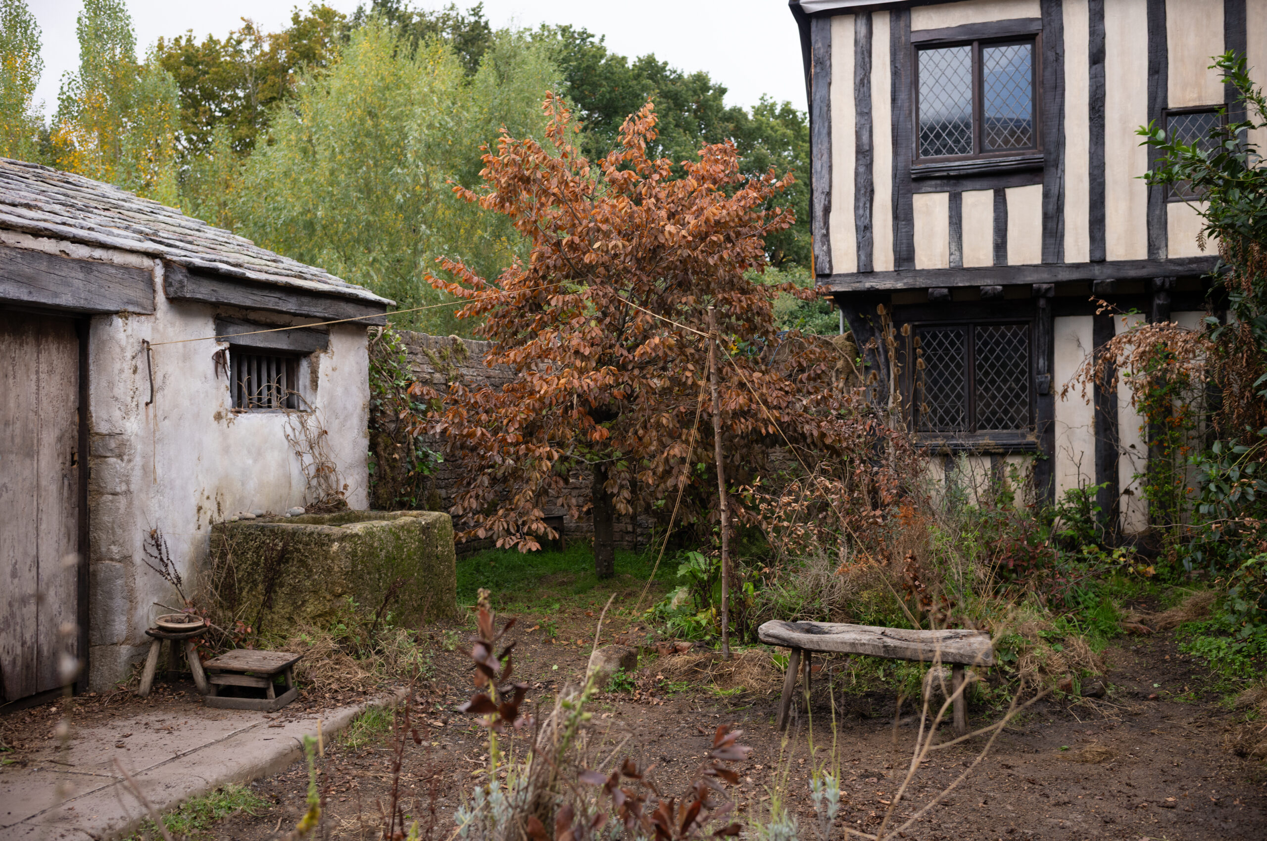 It was a delight to immerse ourselves in the details of Agnes’s herbal world. We had fantastic support from Kim Walker, a herbalist, and Amanda Willgrave, our florist. Kim worked closely with Jessie, foraging and mixing herbs. Amanda planted a real herb garden at Elstree Studios, which we cut from daily to dress the sets. Lizzie Bravo, our action prop buyer, was essential in sourcing detailed and period-correct pieces.