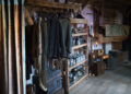 For the glove workshop, we had a skilled team of leather workers creating beautiful recreations of gloves, both finished and partially made, along with tool rolls, storage and leather components. For the leather tools, we found a collector in Paris with an extensive collection of period pieces. The entire set had a strong sensory quality — leather, stone and wood. Walking into the glove workshop, you could see all the elements that go into making a glove: the colour of the leather, the lace or trim, the buttons and the finishing details.