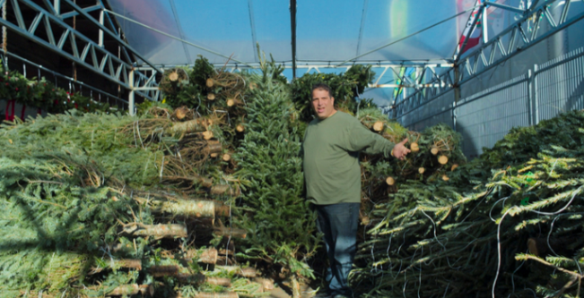 a man stands among christmas trees in The Merchants of Joy christmas tree doc