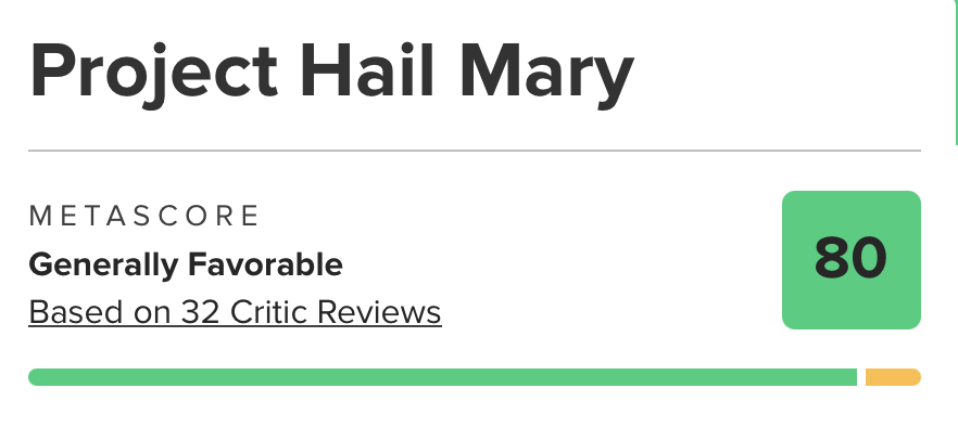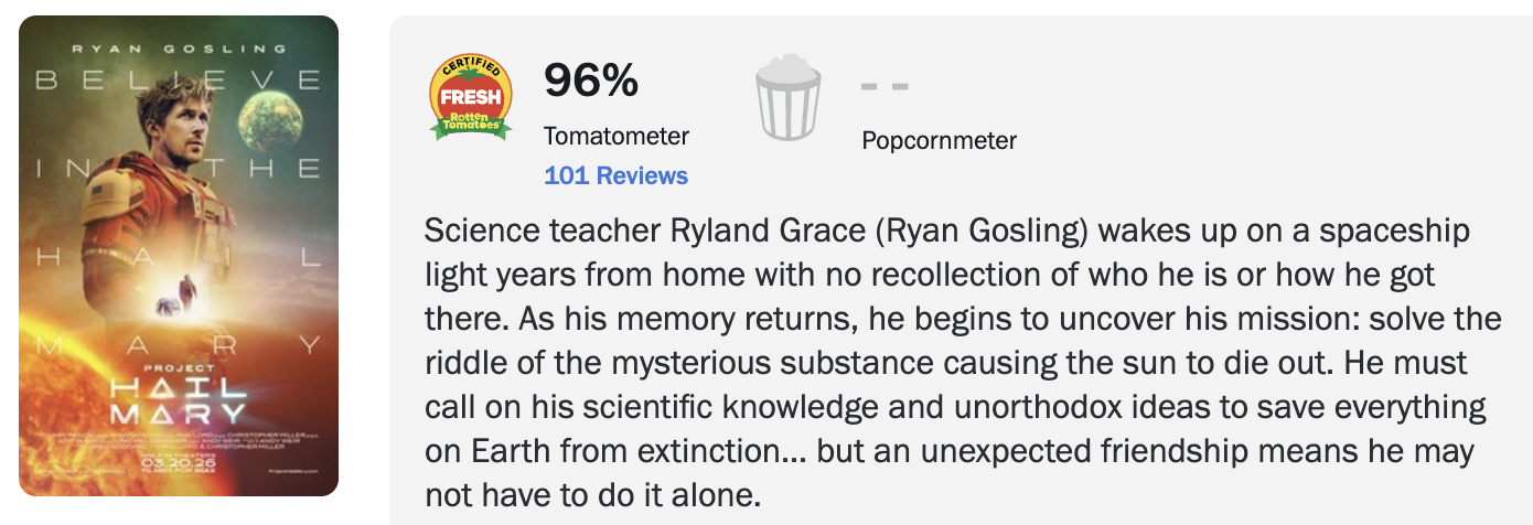 I waited until the end of the day to post this because I wanted Project Hail Mary’s initial Rotten Tomatoes reviews to settle a bit. When the embargo broke, dozens of critics loaded lavish praise on Ryan Gosling’s upcoming film. It debuted on the site with an excellent 95% approval rating.