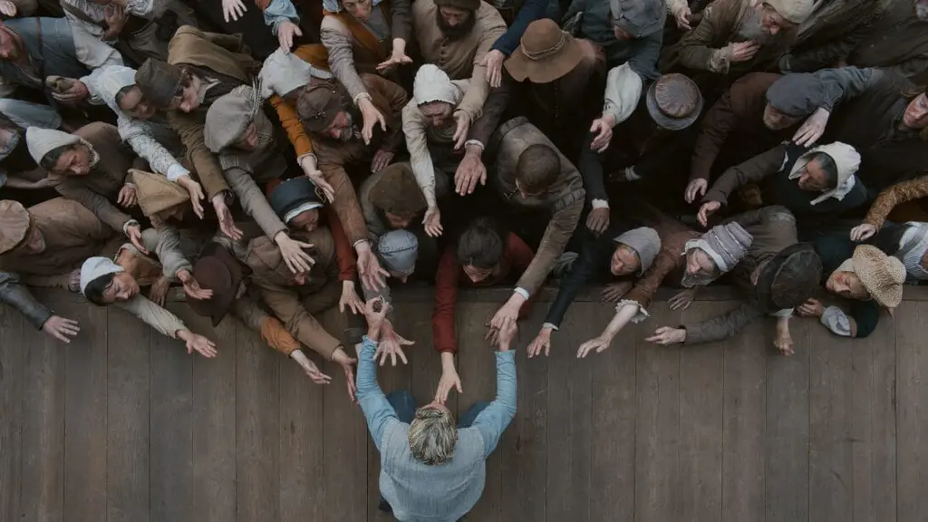 The Globe Theatre finale where Agnes (Jessie Buckley) witnesses her husband’s (Paul Mescal) performance of Hamlet, blurring her grief with communal mourning as the crowd reaches out in waves.
